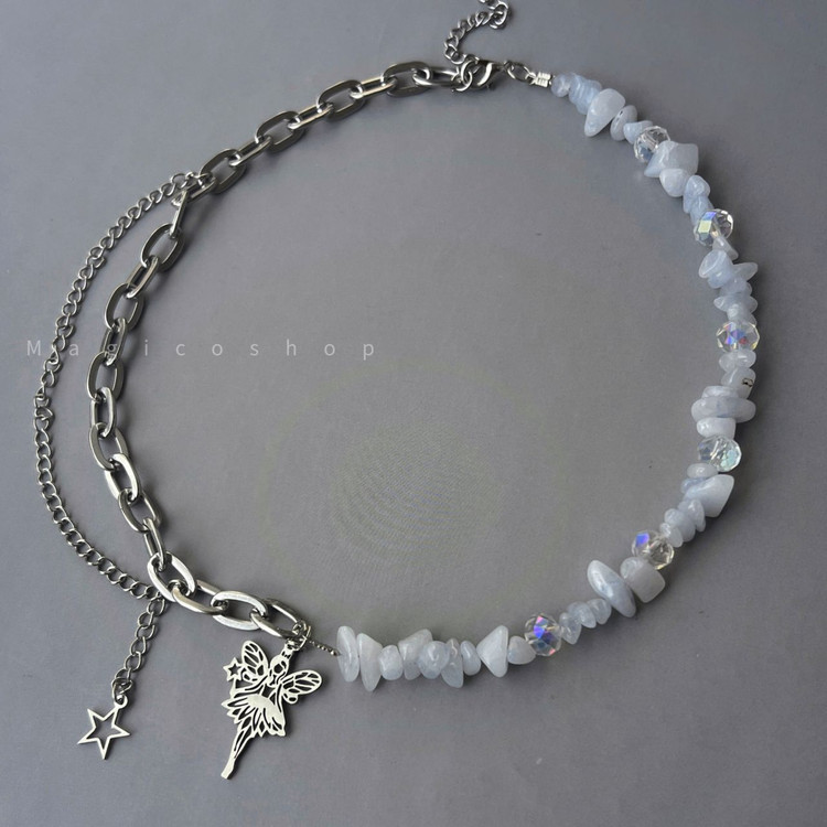 این گردنبند با استفاده از سنگ طبیعی عقیق سفید طراحی شده که از دیرباز به عنوان سنگی آرامشبخش و متعادلکننده شناخته میشه. کنار اون، زنجیر استیل ضد حساسیت و آویزهای ظریف فرشته و ستاره، به این اکسسوری جلوهای فانتزی، لطیف و متفاوت دادن.